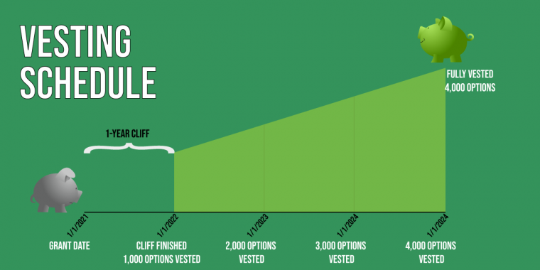 Steve starts working at ABC Inc. on January 1st, 2021. When hired he’s offered 4,000 stock options at $1.13 per share. However, there is a 4-year vesting period, with a 1-year cliff.